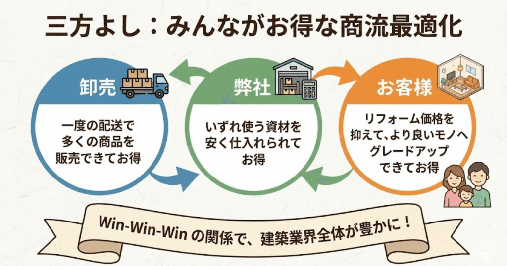 - やり方: 現場ごとの「都度発注」をやめました。リノベーションで標準的に使用するサイズ(13Aなど)をあらかじめ予測し、自社で在庫を持つ「ボリュームディスカウント」を導入しました。